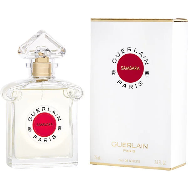 Samsara Eau de Toilette is a woody-floral fragrance with a sweet, citrusy opening of bergamot, peach, ylang-ylang, and green notes. The heart reveals jasmine, rose, and violet, while tonka bean, vanilla, iris, and sandalwood create a sweet, fresh, and enchanting base for lasting sophistication.